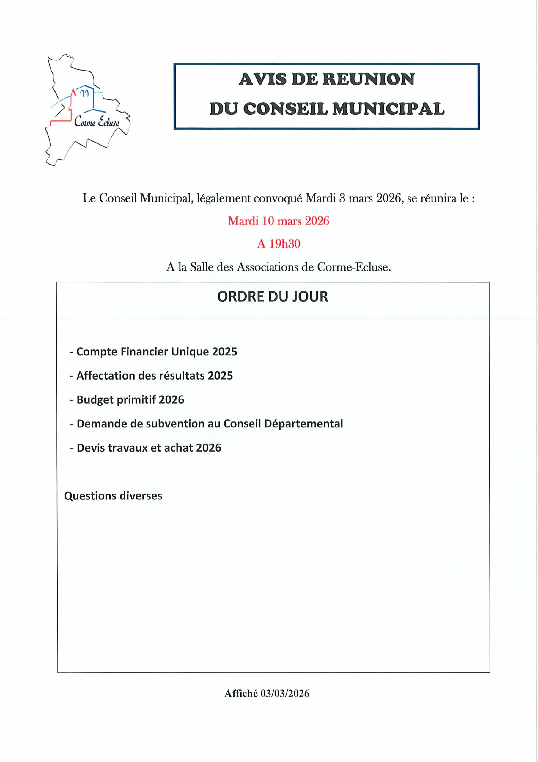 Réunion du Conseil Municipal le mardi 10 mars 2026 à 19h30 à la Salle des Associations de Corme-Ecluse
